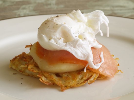 Potato latke, warm brie, smoked salmon, poached egg.